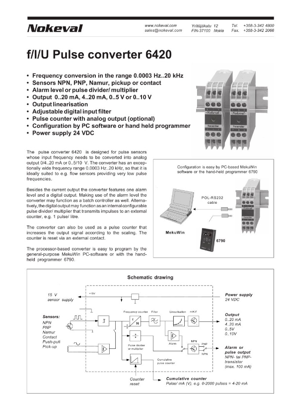 脉冲转换器6420设计用于需要将输入频率转换为0/4...20 mA或0...5/10 V模拟输出的脉冲传感器,该转换器的频率范围非??恚?.0003 Hz...20 kHz,因此非常适合提供非常低脉冲频率的流量传感器。 除了电流输出,转换器还具有一个报警电平和一个数字输出。利用报警电平,转换器也可以作为一个批处理控制器来使用。另外,数字输出可以作为一个内部可配置的脉冲分压器/乘法器,将脉冲传输到外部计数器,例如1个脉冲/升。 转换器也可以作为脉冲计数器,根据缩放增加输出信号。计数器通过一个外部触点进行复位。 基于处理器的转换器很容易通过通用的MekuWin PC软件或手持式编程器6790进行编程。