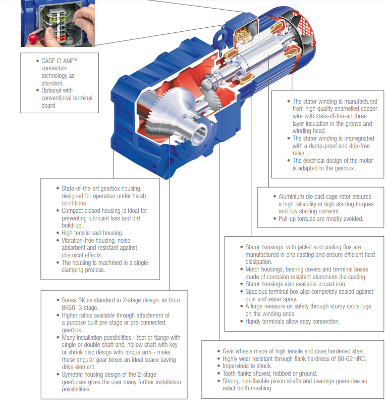 BS 减速电机是经济的直角涡轮减速电机,可安装在极为狭小的空间内。经济划算的直角涡轮减速电机为可靠性、效率和经济性树立了新标准,具备无与伦比的标准特点,如:最小尺寸的空心轴。逆变器友好型设计不仅可确保目前轻松集成,而且还能满足未来需求。BS 减速电机拥有灵活的安装选件,包括轴、基座、表面与法兰解决方案。电机接线盒可以安装在围绕电机架旋转 90° 的其他位置,实现无与伦比的集成可能性。