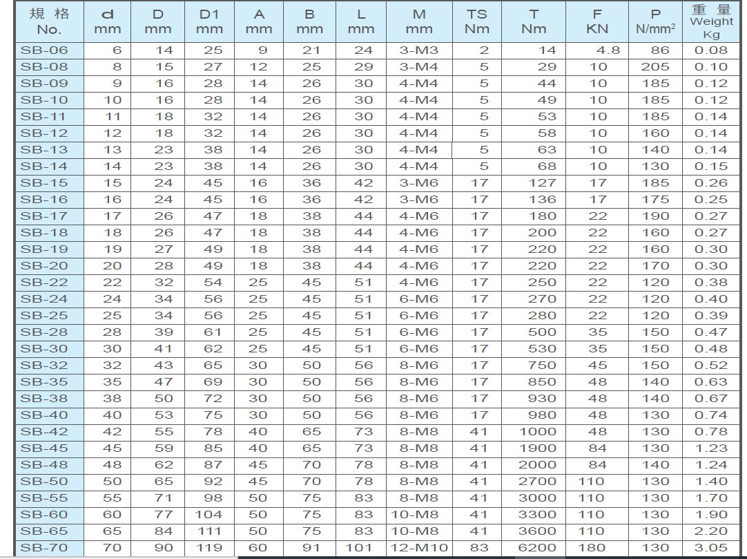 仕勋SB-18 SB-20 SB-22免键式轴套 轴环使用上的注意事1 所需傳動扭力的確認2 軸與孔的加工精度要求3 同心度的要求4 是否有防銹的需求以上為一般注意事項,若有特別需求,請與我們聯絡
